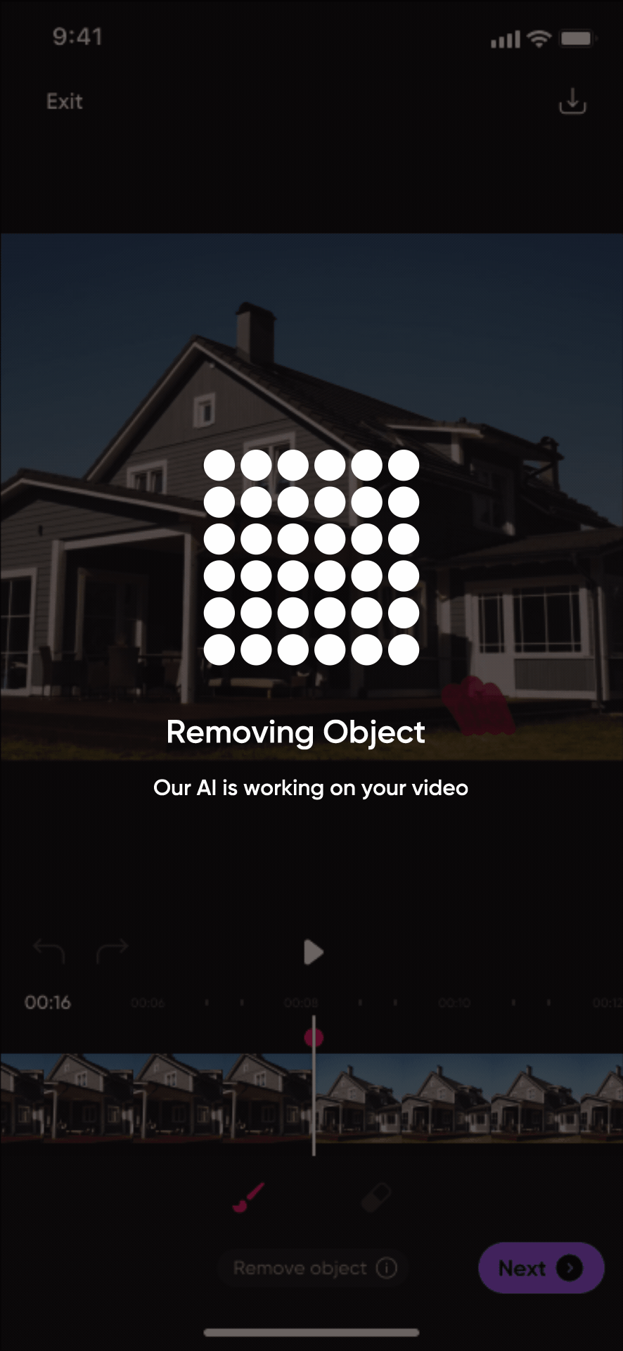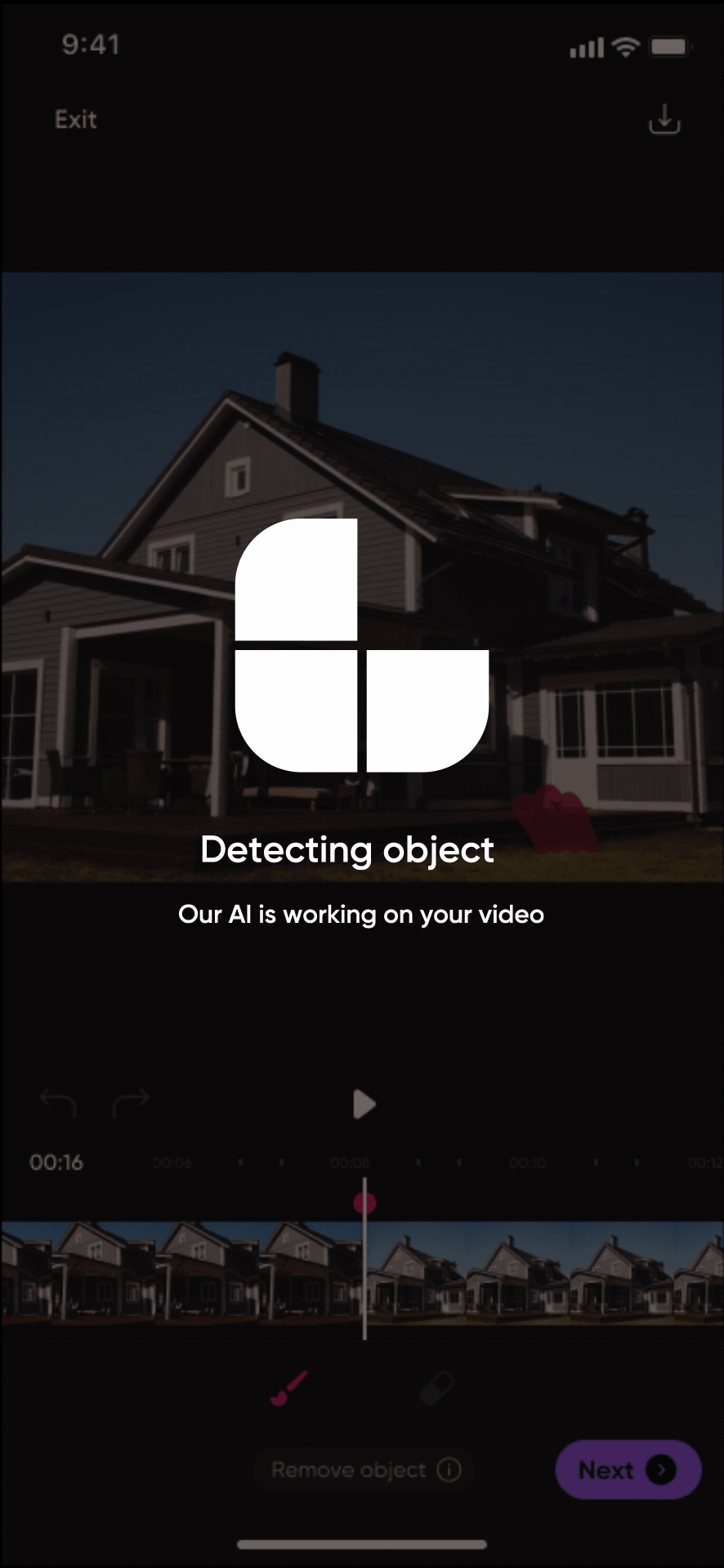 Loading animation for the video object removal tool, segmented into two phases: detection and tracking, followed by object removal.